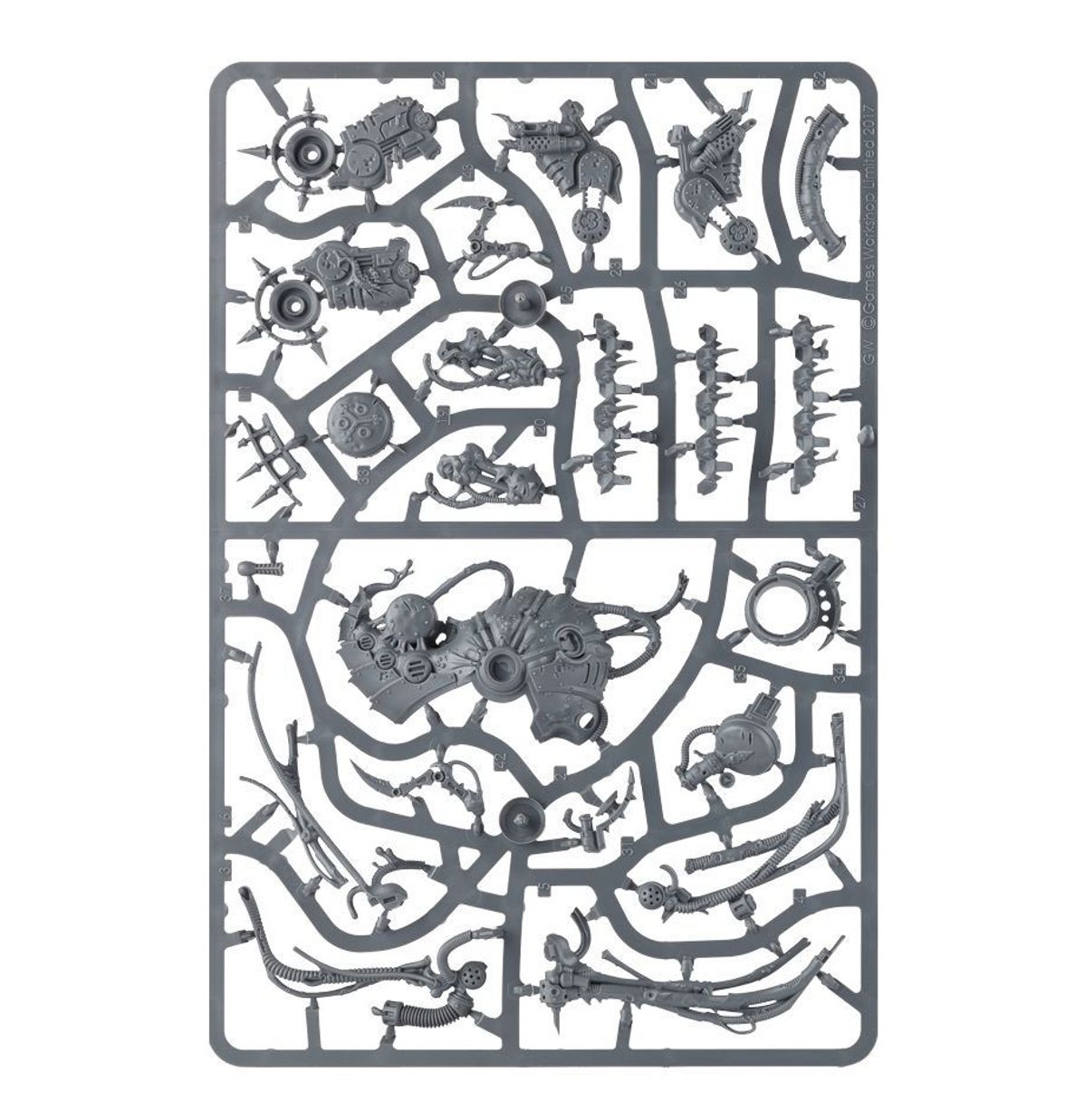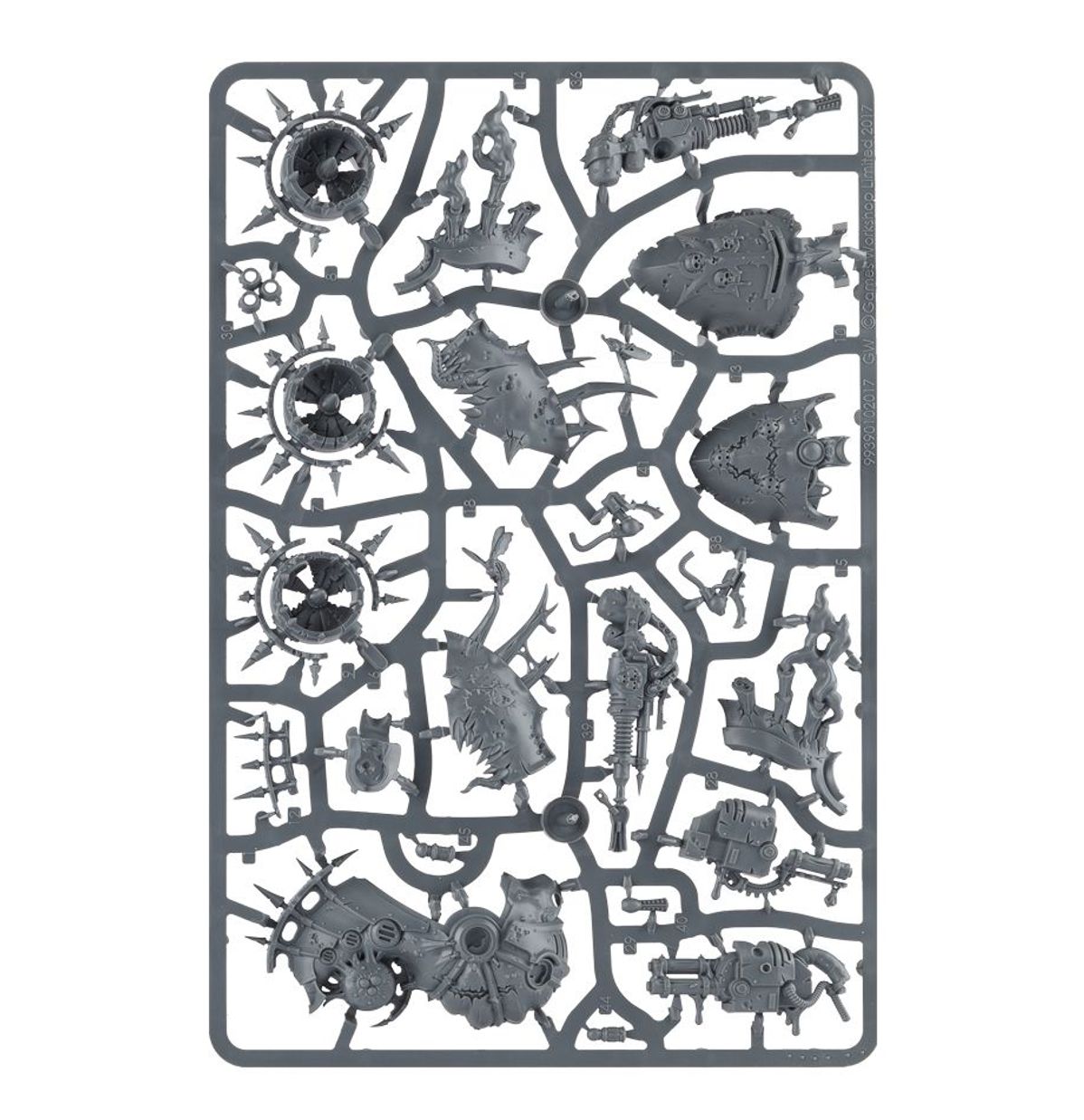 This multi-part plastic kit contains the components necessary to assemble a Foetid Bloat-drone. A huge, intimidating amalgamation of machine and rotting meat, the front of the model is dominated by a carapace which can be assembled as 1 of 3 options – one featuring a Nurgle symbol picked out in skulls, one featuring the symbol carved into the carapace, and one featuring a hideous toothed maw covered in pustules, tentacles and hoses dangling from within. It comes armed with 2 plague spitters and a plague probe; whichever carapace you pick, the plague spitters can be replaced with either a heavy blight launcher or a flesh mower (which looks as utterly ghastly as it sounds…) The back of the model is a riot of horrendous detail, with obscenely stretched skin spilling over the metal structures that barely contain it