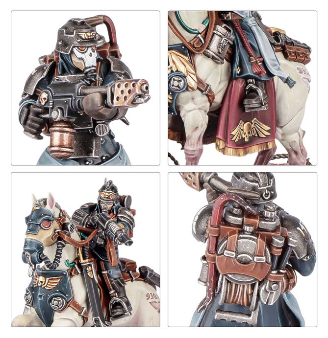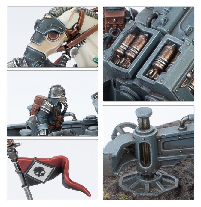 As is tradition in the armies of Krieg, Lord Marshal Varnan Dreir leads this force from the front atop his loyal steed, armed with a laspistol and sabre. Behind him rides a squad of ten Death Riders – bold cavalry who thunder across no man's land with lances levelled and sabres drawn. Six Combat Engineers – demolition experts, sappers, and close-quarters trench fighters support them. They are tasked with clearing razorwire and defusing mines before bringing their shotguns and trench clubs to bear upon the enemy. Finally, an Artillery Team uses towed weapons to hurl various munitions capable of eliminating entire squads of infantry, cracking open reinforced bunkers, and laying waste to armoured convoys.