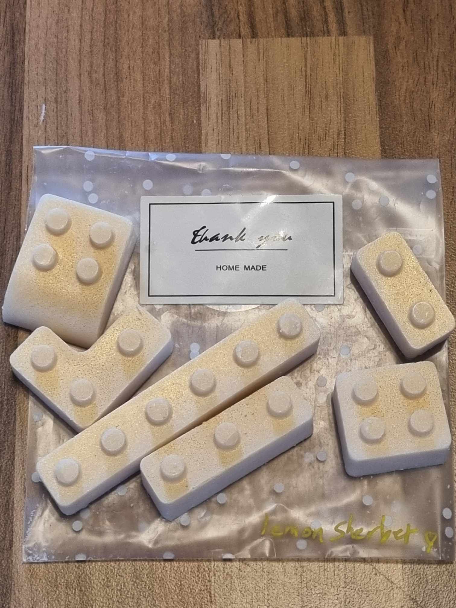 7-off small Lego brick style shaped wax melts, yellow in colour. Lemon sherbet scent.