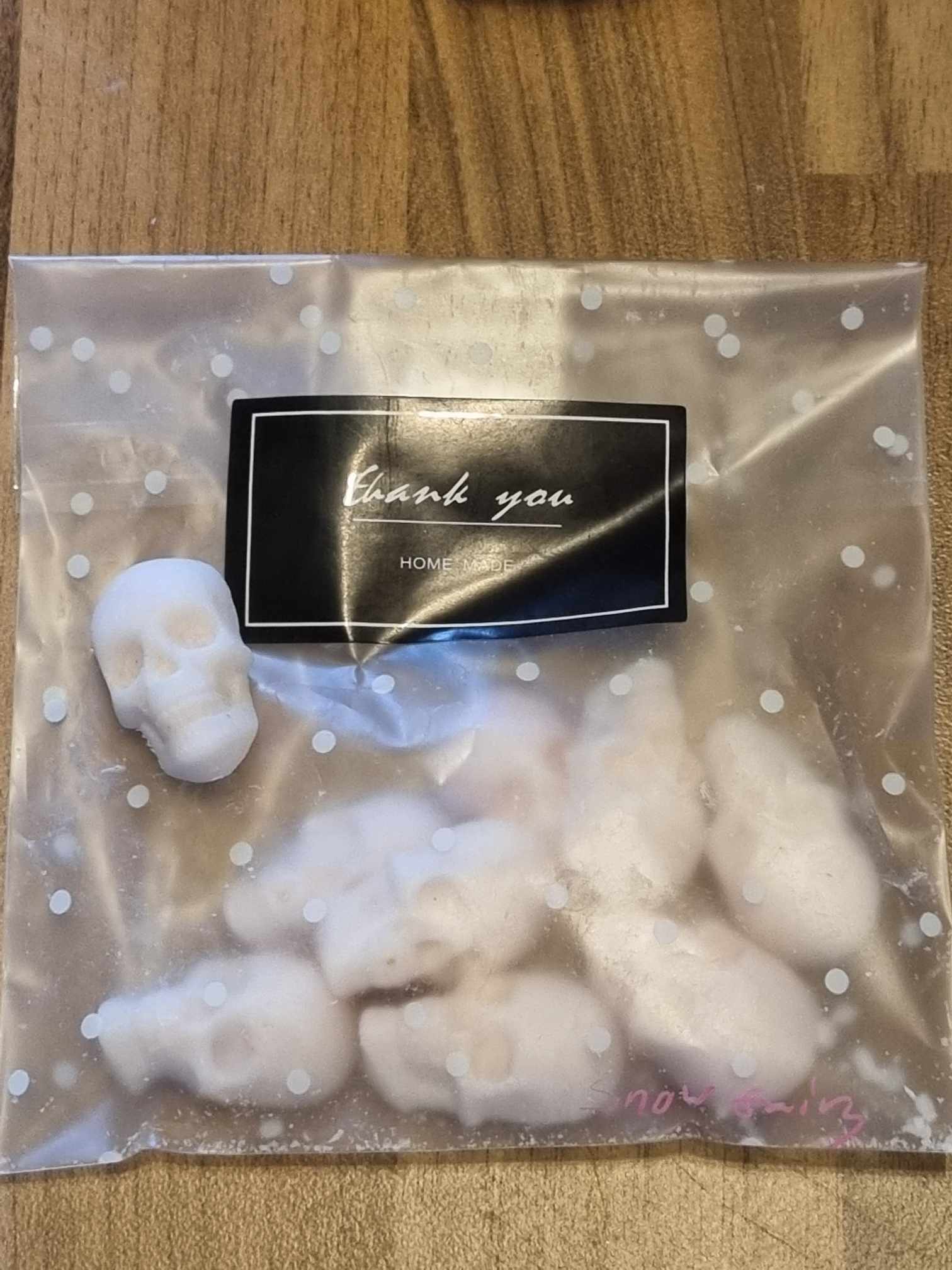 9-off small skull shaped wax melts, light pink in colour. Snow fairy scent.