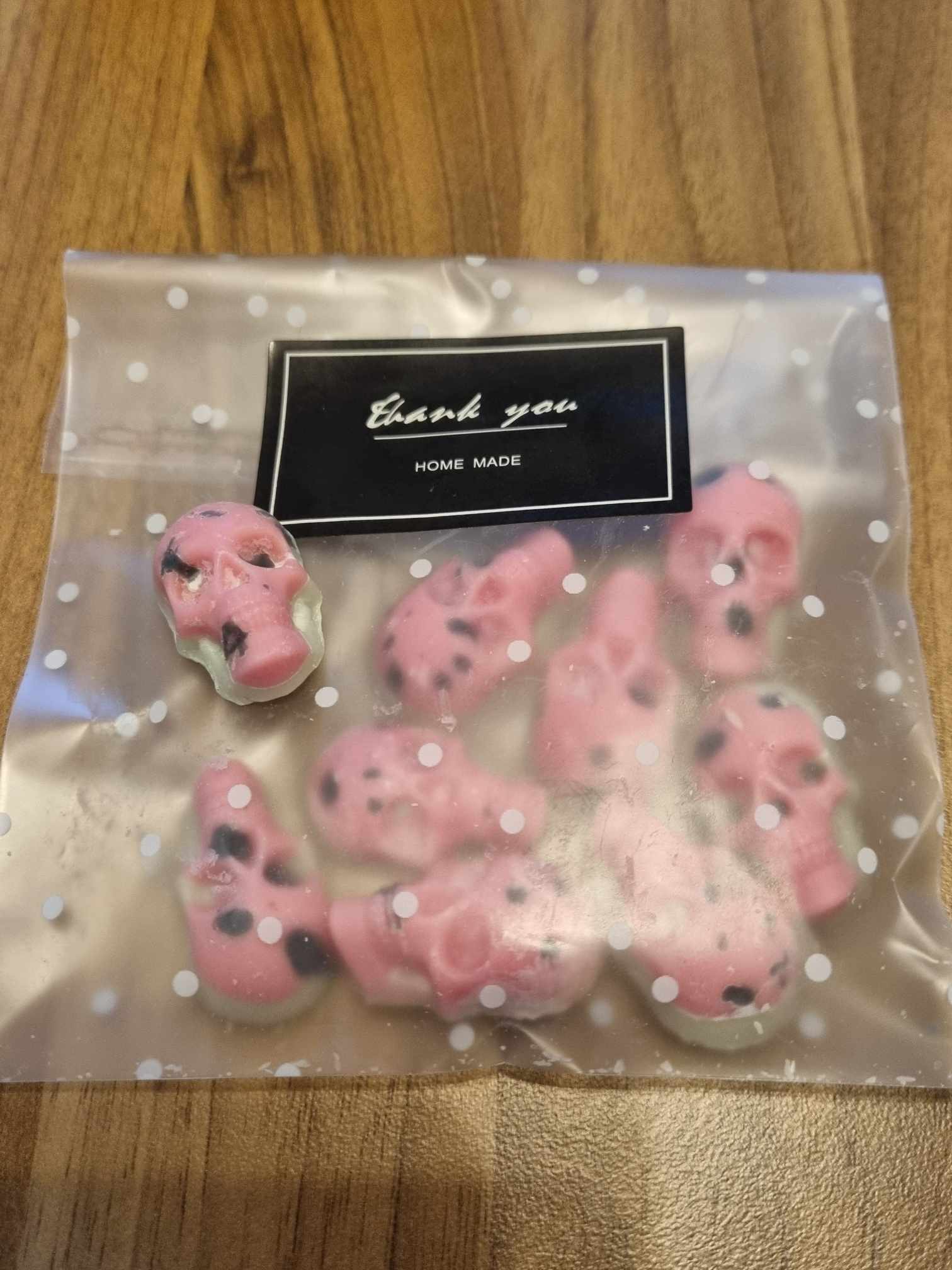 9-off small skull shaped wax melts, pink, black and lime green. Watermelon scent.