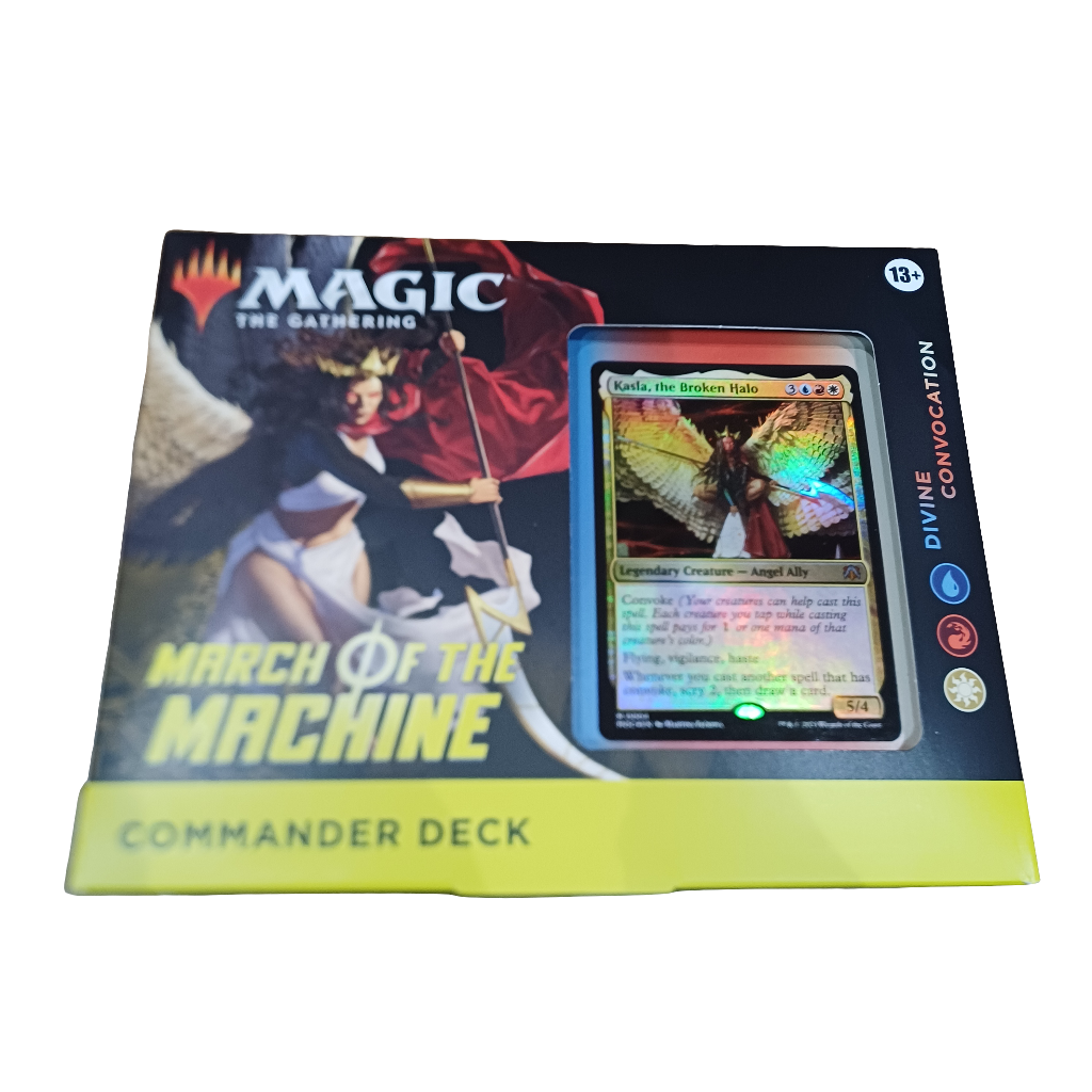 This March of the Machine Commander Deck set includes 1 ready-to-play deck of 100 Magic cards (2 Traditional Foil Legendary cards, 98 nonfoil cards), 10 specialty cards, a 2-card Collector Booster Sample Pack, 1 Foil-Etched Display Commander (a thick cardstock copy of the commander card with foil etched into the card’s border and art), 10 double-sided tokens, 1 deck box (can hold 100 sleeved cards), 1 Life Wheel, 1 special die, 1 strategy insert, and 1 reference card.