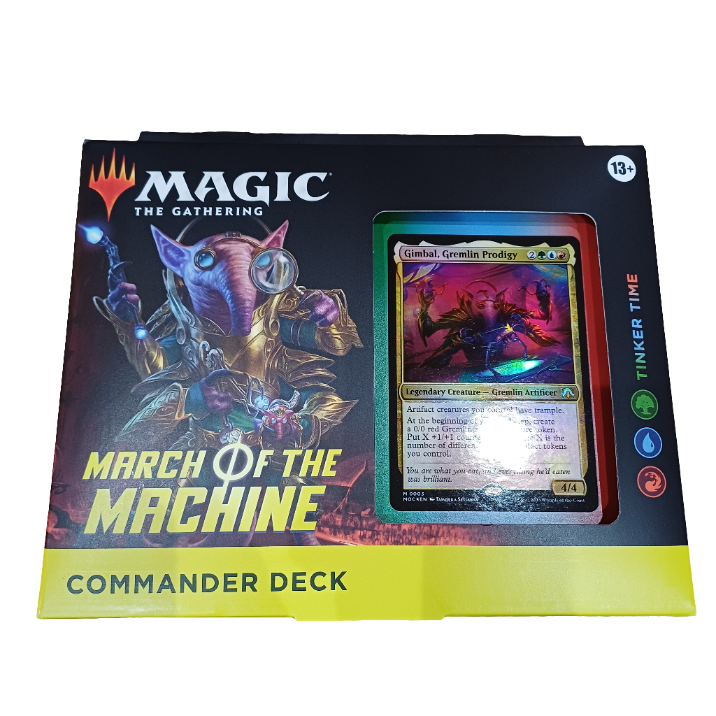 This March of the Machine Commander Deck set includes 1 ready-to-play deck of 100 Magic cards (2 Traditional Foil Legendary cards, 98 nonfoil cards), 10 specialty cards, a 2-card Collector Booster Sample Pack, 1 Foil-Etched Display Commander (a thick cardstock copy of the commander card with foil etched into the card’s border and art), 10 double-sided tokens, 1 deck box (can hold 100 sleeved cards), 1 Life Wheel, 1 special die, 1 strategy insert, and 1 reference card.