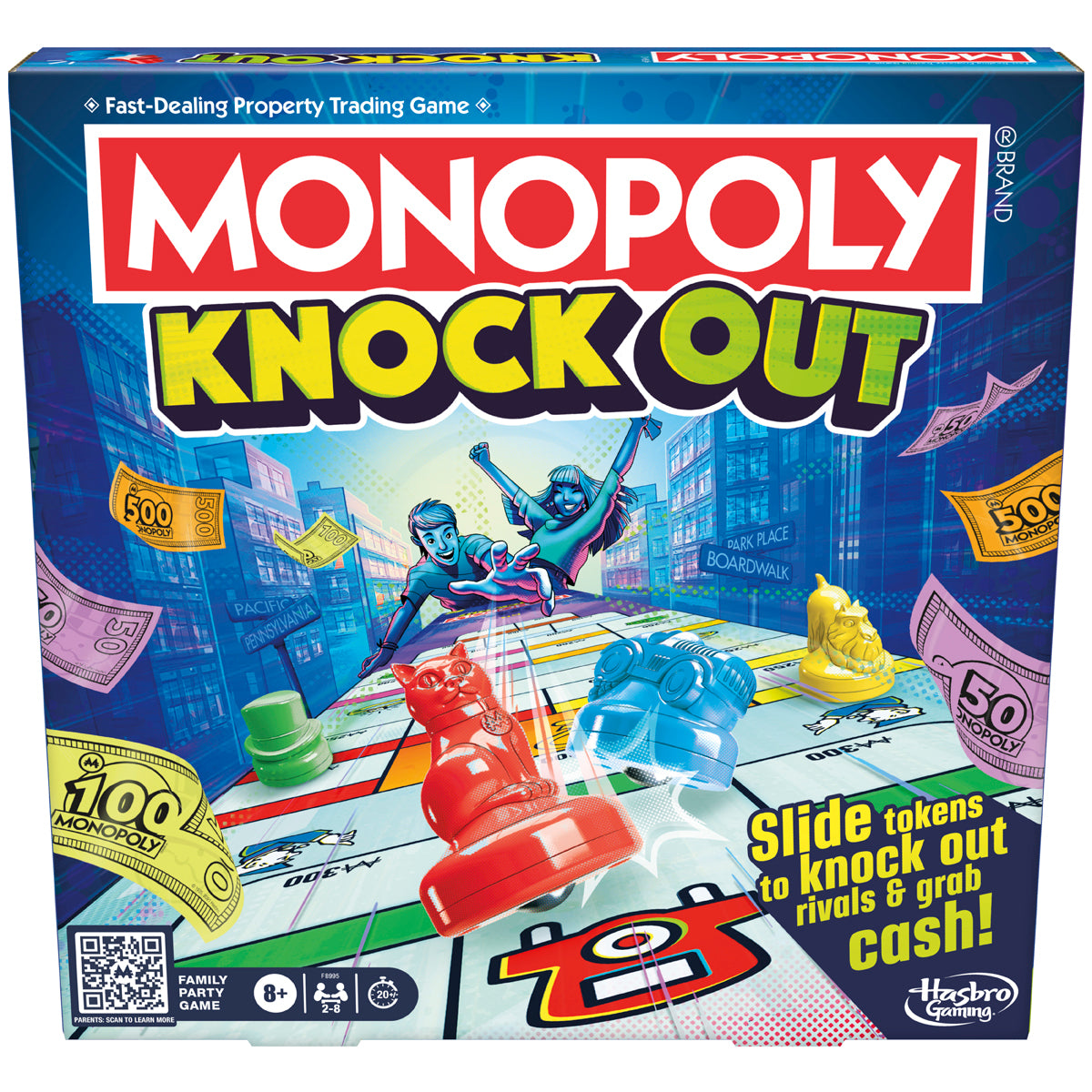 It's the family party game of sliding tokens and cash-grabbing fun! In this up-and-active version of the Monopoly game, compete against opponents in a token showdown. Players play in rounds, taking in turns sliding their tokens down the long gameboard (over 3 feet) and trying to land them on properties. At the end of each round, they'll collect - or pay - cash based on where their tokens ended up.