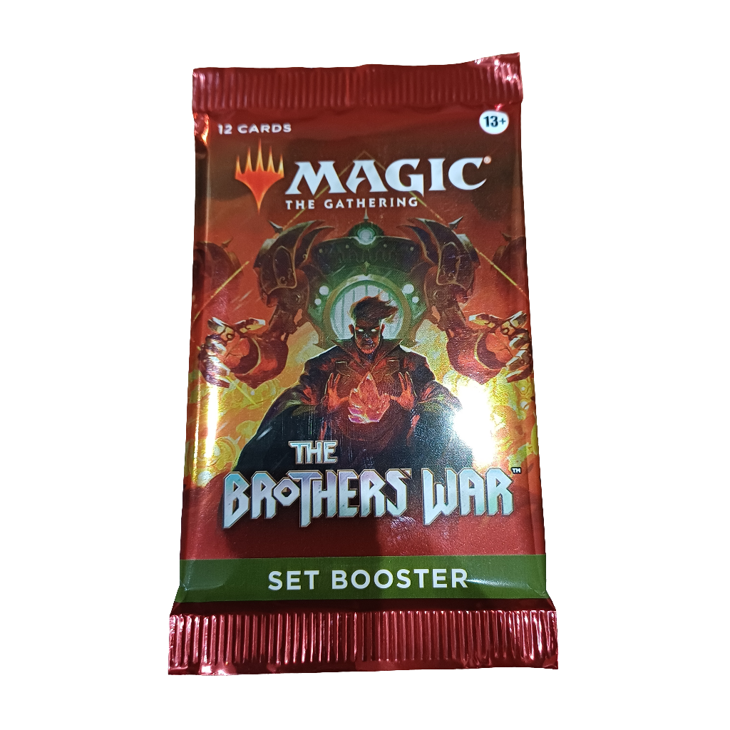 Each The Brothers' War Set Booster contains 12 Magic cards, 1 Art Card, and 1 token/ad card or card from "The List" (a special card from Magic's history - found in 25% of packs). Every pack includes a combination of 1–5 card(s) of rarity Rare or higher and 3–7 Uncommon, 3–6 Common, and 1 Land cards. Traditional Foil Land replaces basic land in 20% of Set Boosters. Foil-Stamped Signature Art Card replaces Art Card in 10% of Set Boosters.