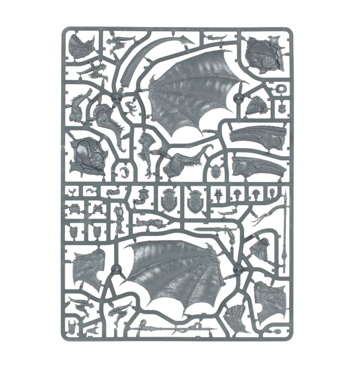 This multipart plastic kit consists of 105 pieces and builds two Stormdrake Guard in several different poses, each able to equip either a drakerider's lance or warblade. It also provides options to construct one as a Knight-Draconis, a powerful Hero capable of supporting nearby Stormdrake Guard. This kit comes supplied with two 105mm Citadel Oval bases and two flying stands, and these miniatures are supplied unpainted and require assembly