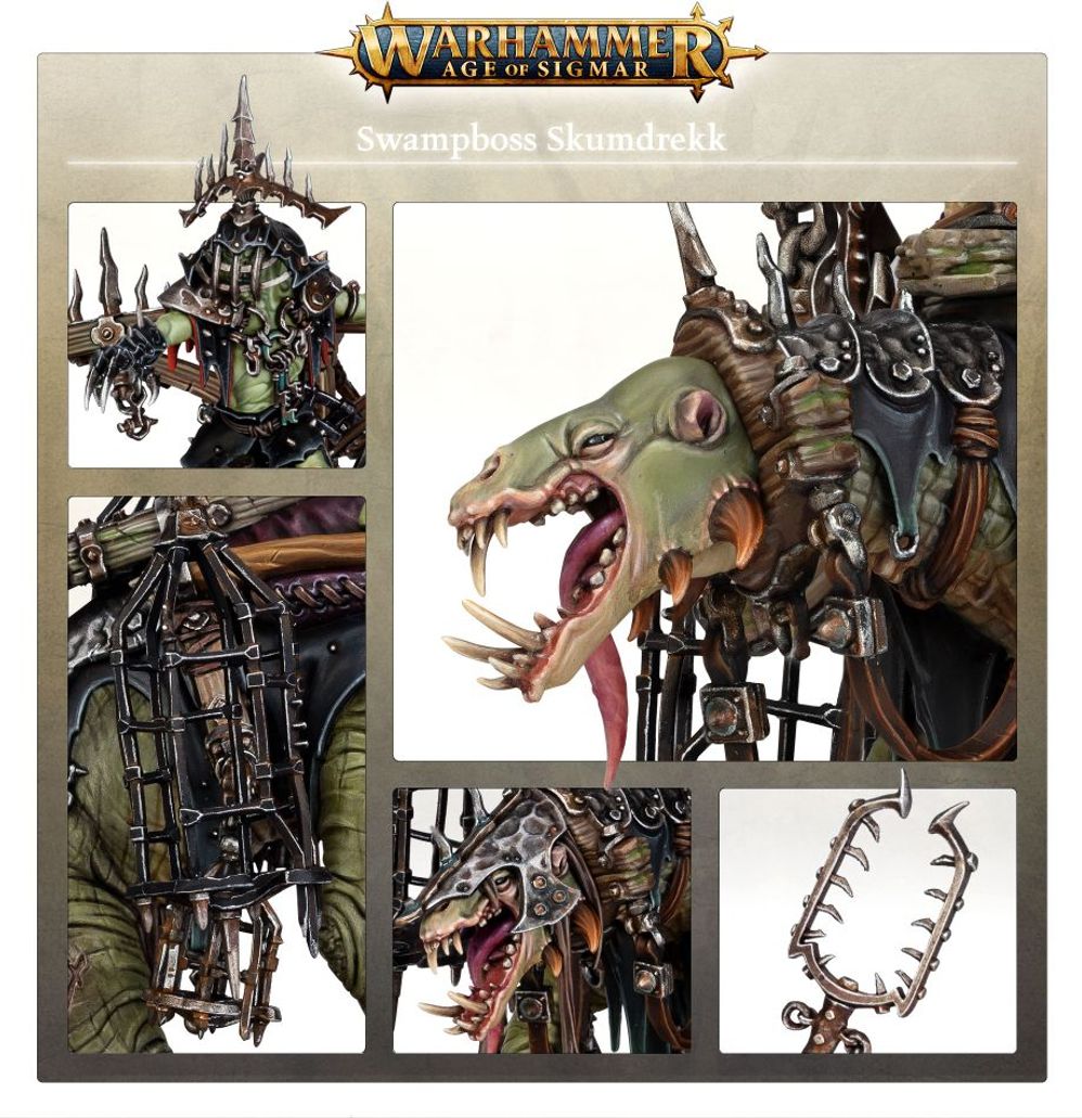 Of all the Snatchabosses, Skumdrekk is the vilest and most kunnin'. As such, he has become a sort of celebrity to the Kruleboyz of Ghur. Owner of the Murkvast Menagerie – a huge, drained mangrove swamp that acts as prison for scores of vicious and unusual beasts – Swampboss Skumdrekk is a living legend. He rides into battle on his most prized conquest, Sloppklaw, the unusually fierce sludgeraker beast he turned to his will as a younger orruk.