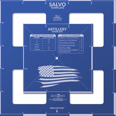 There are two sizes of template available in the game: Artillery (6”/15cm square) and Salvo (10”/25cm square) depending on the ROF rating of the weapons firing. This transparent laser-cut acrylic template integrates both sizes in one handy piece.